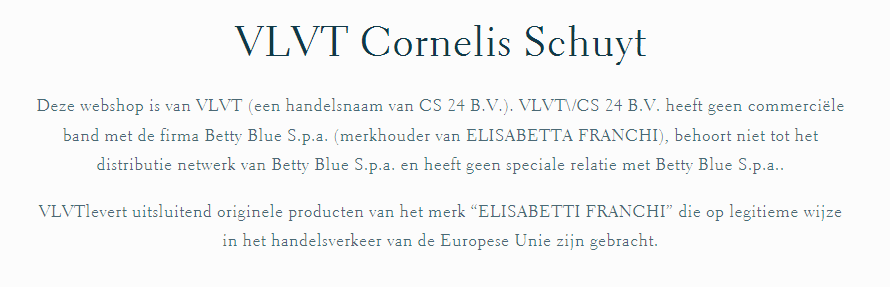 This webshop belongs to VLVT (a trade name of CS 24 B.V.). VLVT/CS 24 B.V. has no commercial relationship with the company Betty Blue S.p.a. (trademark owner of ELISABETTA FRANCHI), does not belong to the distribution network of Betty Blue S.p.a. and has no special relationship with Betty Blue S.p.a.